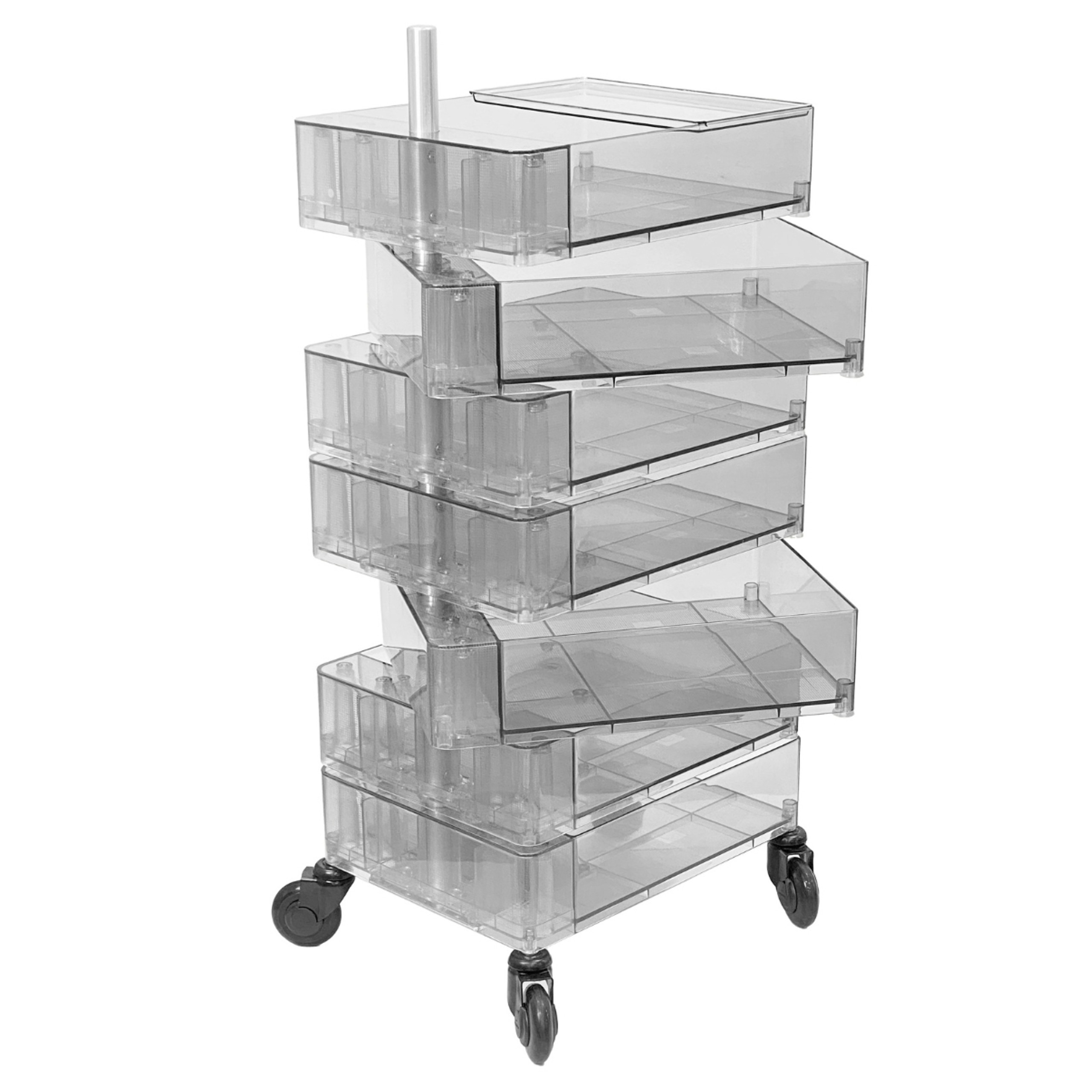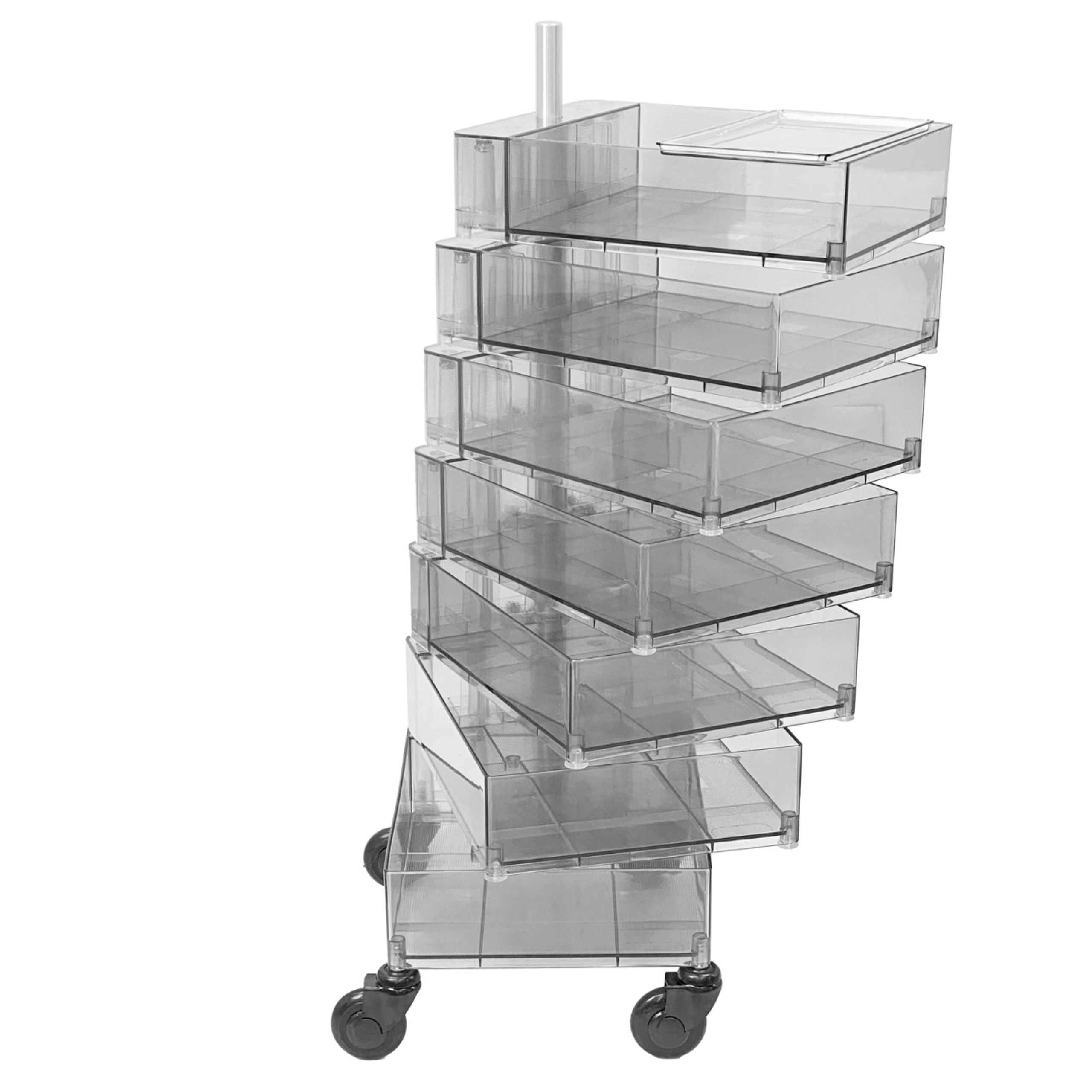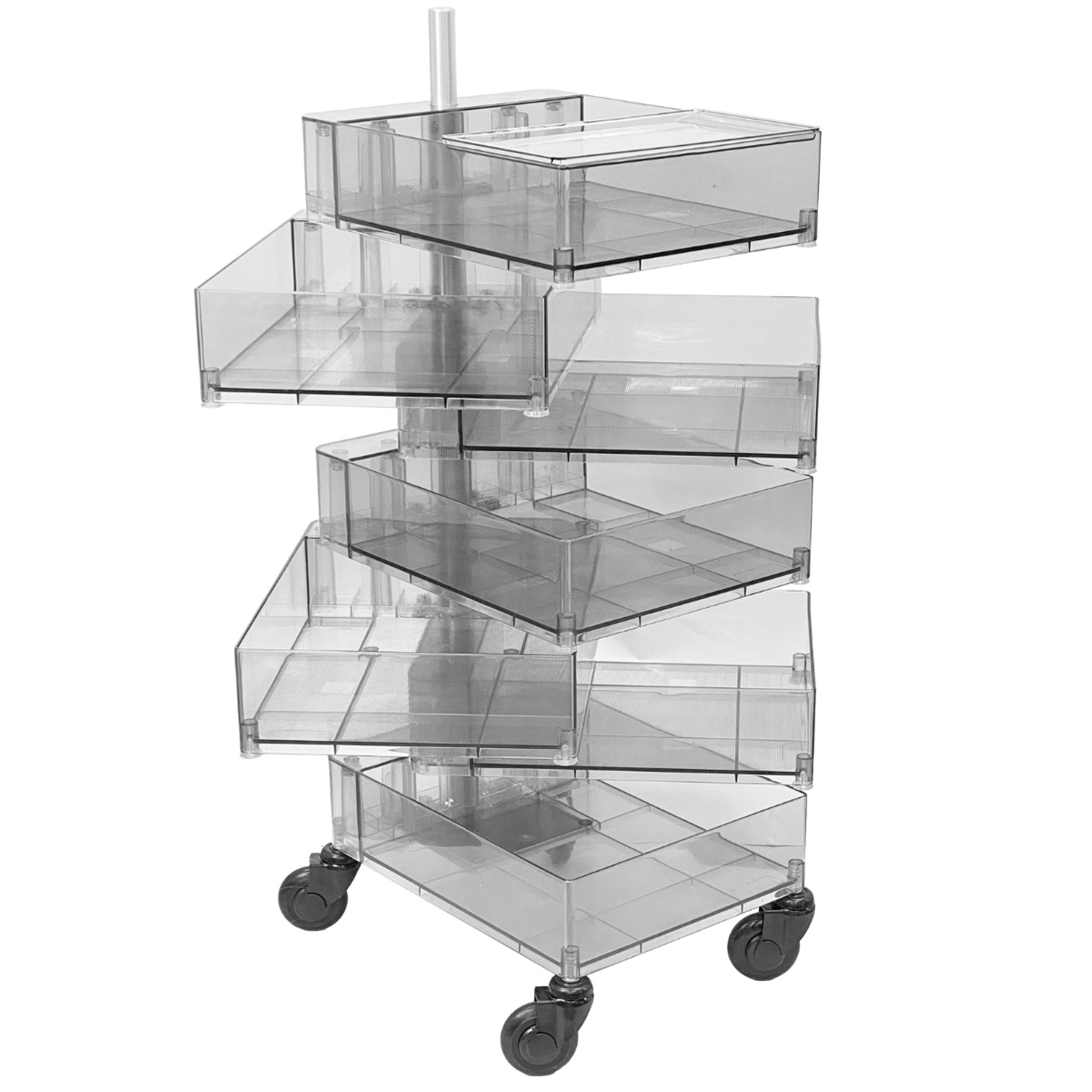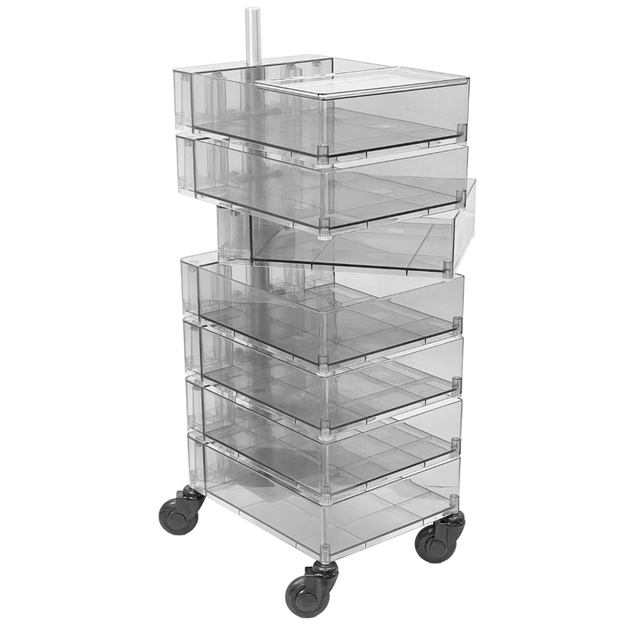 Constructed with durability in mind, the Aries 7 Tier Hairdressing Beauty Salon Trolley boasts a sturdy framework made of high-quality tinted clear ABS plastic, ensuring both transparency and resilience. The inclusion of the tinted clear ABS plastic adds a sleek and contemporary look to the unit. The joining tube, a crucial component of the trolley allows the draws to rotate 360 degree is crafted from robust stainless steel, providing stability and longevity.