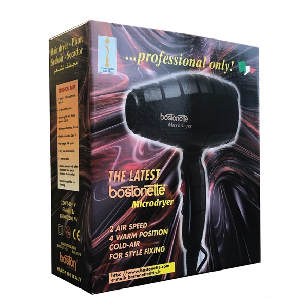 The Bostonette Microdryer is an Italian Professional Dryer with 2200 watts of power. The Microdryer has an ergonomic design and balance and its Micro size means it is extremely lightweight and quiet.