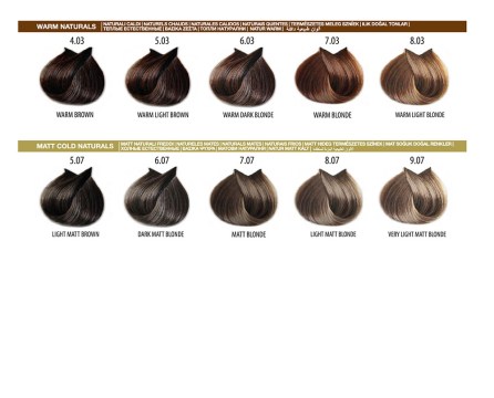 SERIES: Natural, Intense Natural, Warm Natural, Cold Natural Mat, Ash, Golden, Brown / Beige, Mahogany, Auburn, Red, Violet / Irisee, Super-lightening / Neutral.