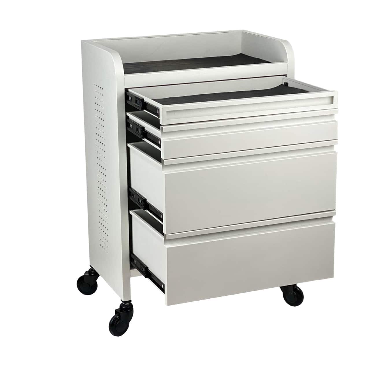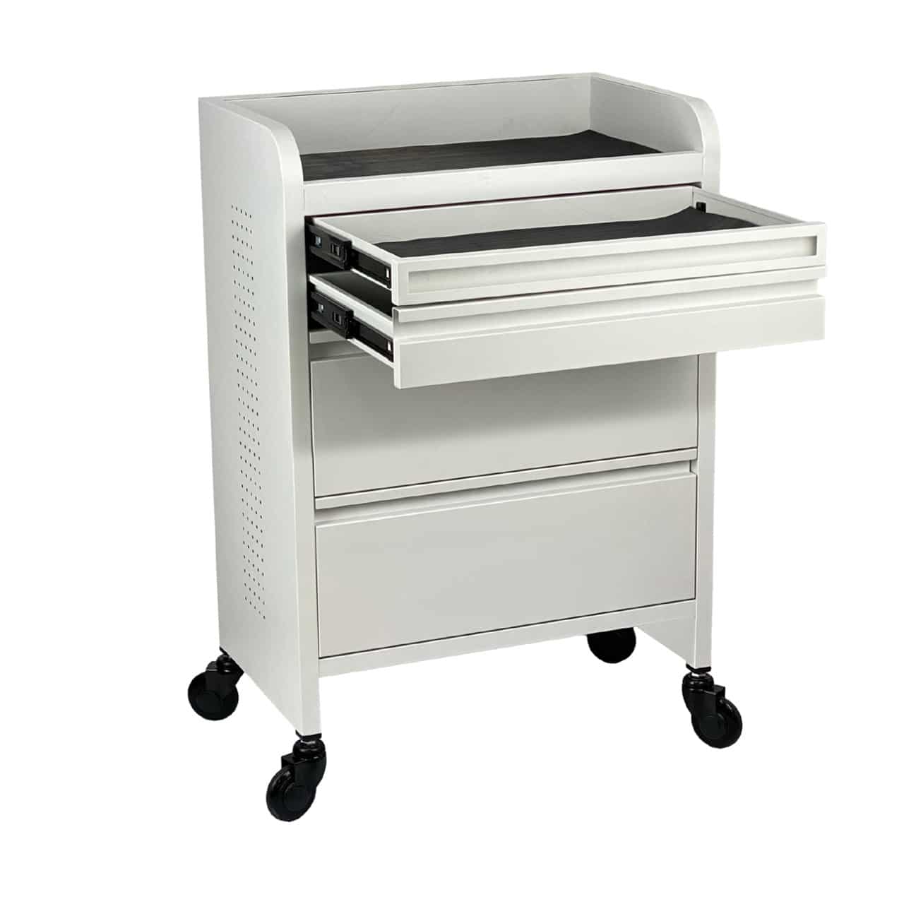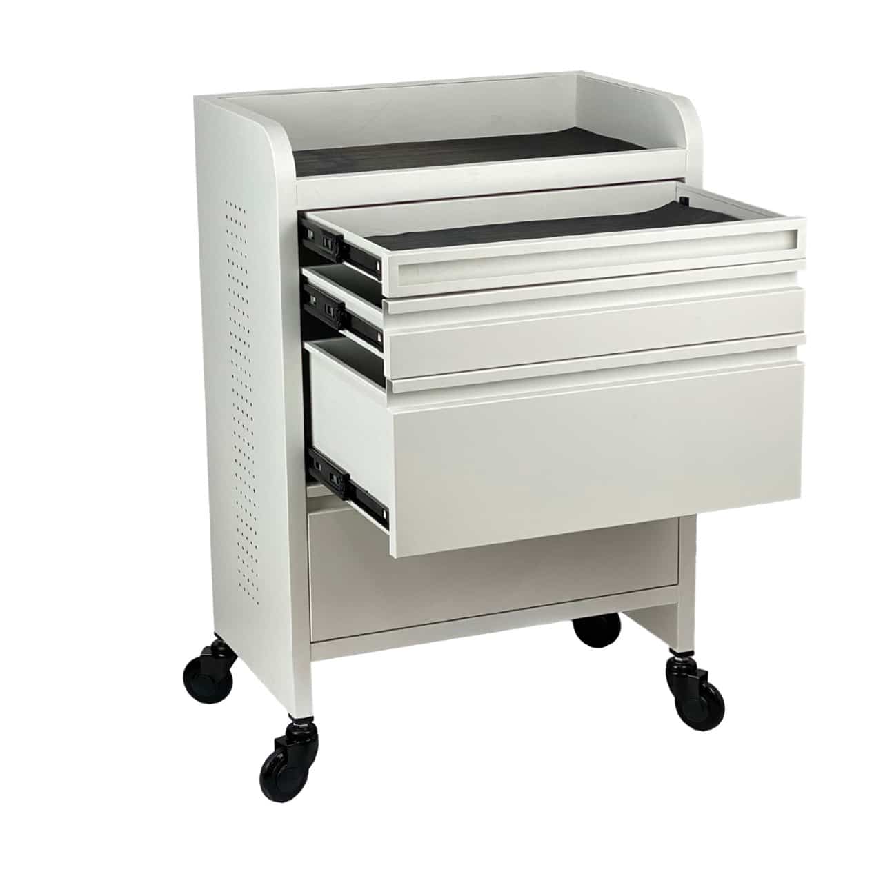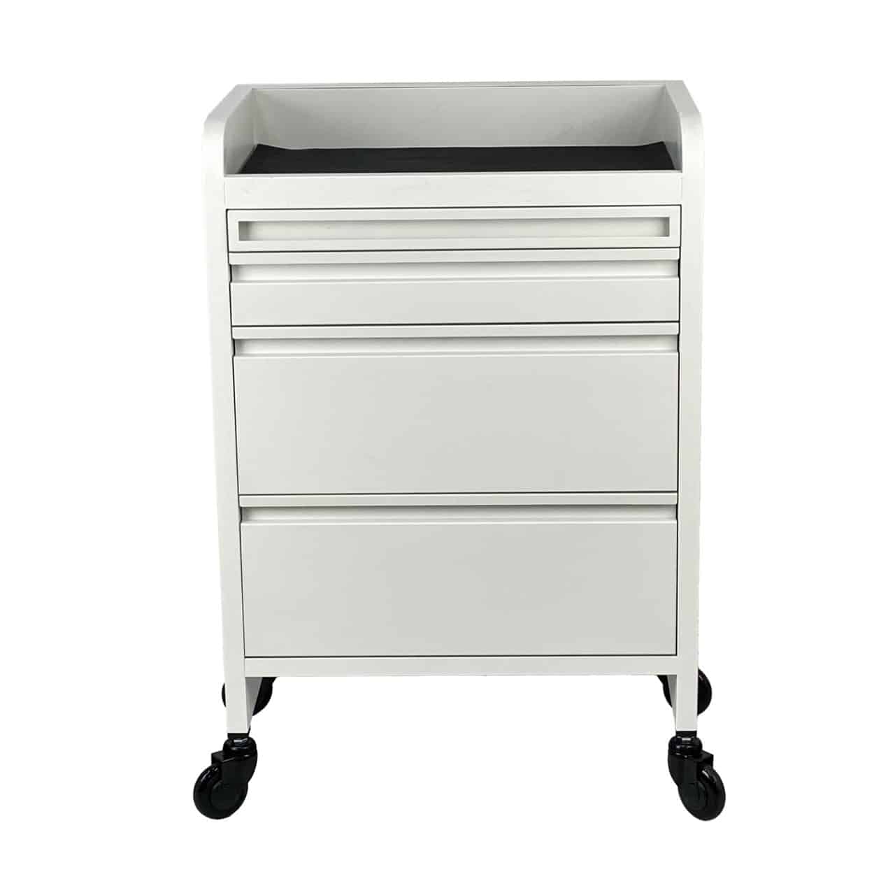 Our high-quality WIDER Fusion PLUS White 4 Drawer Hairdressing Beauty Trolley. Now with a WIDER 100% steel construction frame you can store more of your favourite SALON tools, while offering to keeping them organised in 4 uniquely designed WIDER drawers. To keep all your important tools safe the EXTRA WIDE top and drawers are each supplied with an anti-slip ribbed rubber mat. All the rubber mats can be easily removed for easy cleaning.